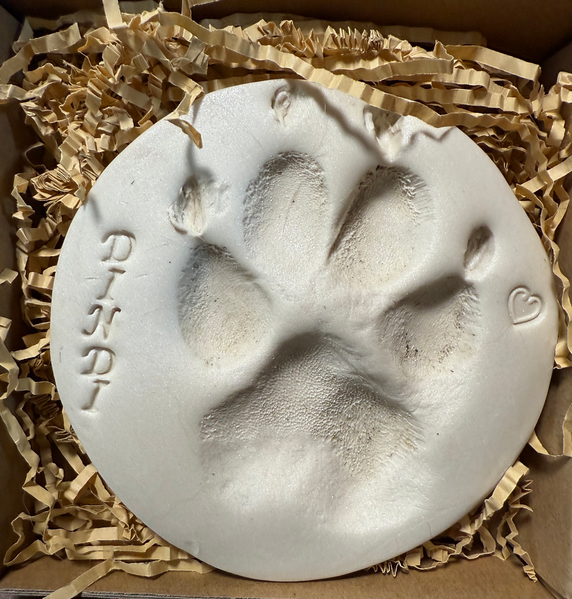 This beautiful keepsake is made from an impression of your pet's paw print and then placed on a river rock with their name.